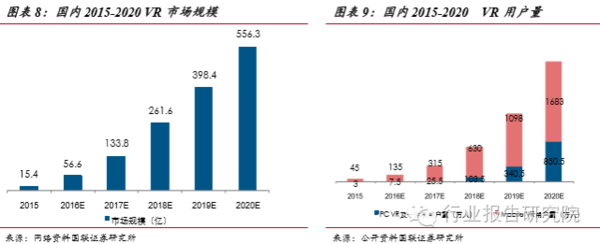 下一代計(jì)算平臺(tái),顛覆眾多傳統(tǒng)領(lǐng)域。預(yù)計(jì)2016年國(guó)內(nèi)VR市場(chǎng)增長(zhǎng)了近四倍, 之后的增速雖然有所減緩,但是市場(chǎng)的規(guī)模成倍增加。到2020年,市場(chǎng)規(guī)??梢赃_(dá)到556億元,用戶量達(dá)到2500萬(wàn),其中PC端用戶量將會(huì)突破850萬(wàn)人,移動(dòng)端將會(huì)達(dá)到1683萬(wàn)人,出貨量達(dá)到820萬(wàn)臺(tái),其中PCVR一體機(jī)的出貨量170 萬(wàn)臺(tái),移動(dòng)VR出貨量750萬(wàn)臺(tái),移動(dòng)端的VR市場(chǎng)爆發(fā)的更加的迅速,市場(chǎng)潛力更大。